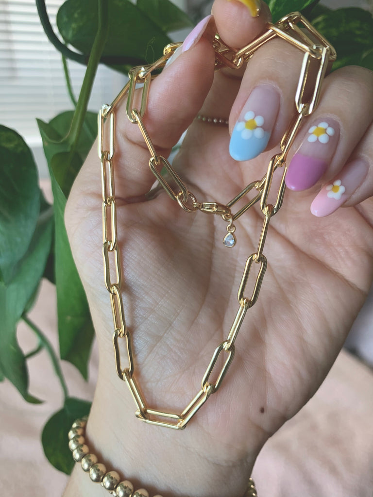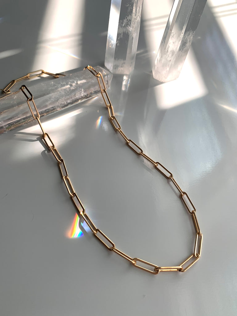 The coolest layering paperclip chain in solid 14k gold filled in large link. Water and sweat resistant. Wear it with anything and everything.